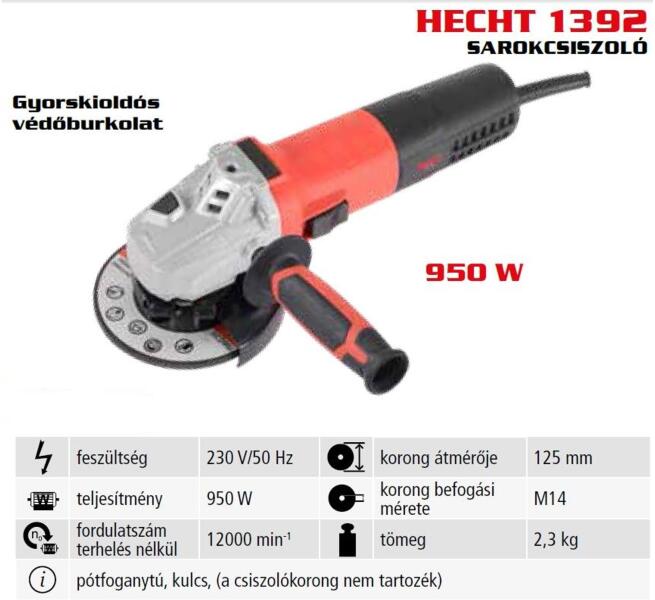 elektromos motor 230V/50Hz teljesítmény [W]950 fordulatszám terhelés nélkül [ford. /perc]12000 korong átmérője [mm]125 korong befogási mérete M14 tömeg [kg]2,3 elektromos motor 230V/50Hz A Hecht 1392 robusztus elektromos sarokcsiszoló tökéletes otthoni használatra. Könnyen kezelhető, egyszerű a korongok cseréje.   A pótfogantyú biztonságosabb tartást biztosít. A gépen gyorskioldós védőburkolat található. A korong átmérője 125 mm, a korong belső átmérője 22,2 mm. A korong befogási mérete M14. Az 950 watt-os motor lehetővé teszi a 12000-es fordulatot percenként.  A csiszolókorong nem tartozék.  A HECHT márkanév Csehországban közel 22 éves múltra tekint vissza, amely idő alatt mára egy kiváló ár-érték arányú, piacvezető márkává nőtte ki magát. A HECHT kerti gépek az elmúlt évtizedben már meghódították a németországi, a lengyel, ill. a szlovák piacokat is, a rendkívül precíz német piacon pedig a HECHT termékek számos szakmai díjat, elismerést is elnyertek. Mindezek alapján joggal kimondhatjuk, hogy a HECHT márka Közép-Kelet Európai szinten összeforrt a megbízható, kiváló minőségű kerti gépek és eszközök fogalmával, és minden a ház körül felmerülő kerti- és barkács feladathoz tudunk Önnek magas minőségű megbízható gépet kínálni.
